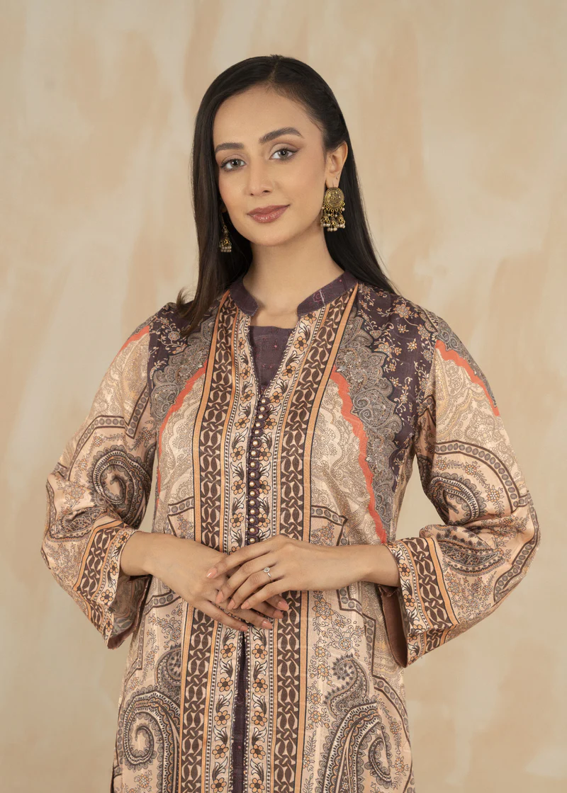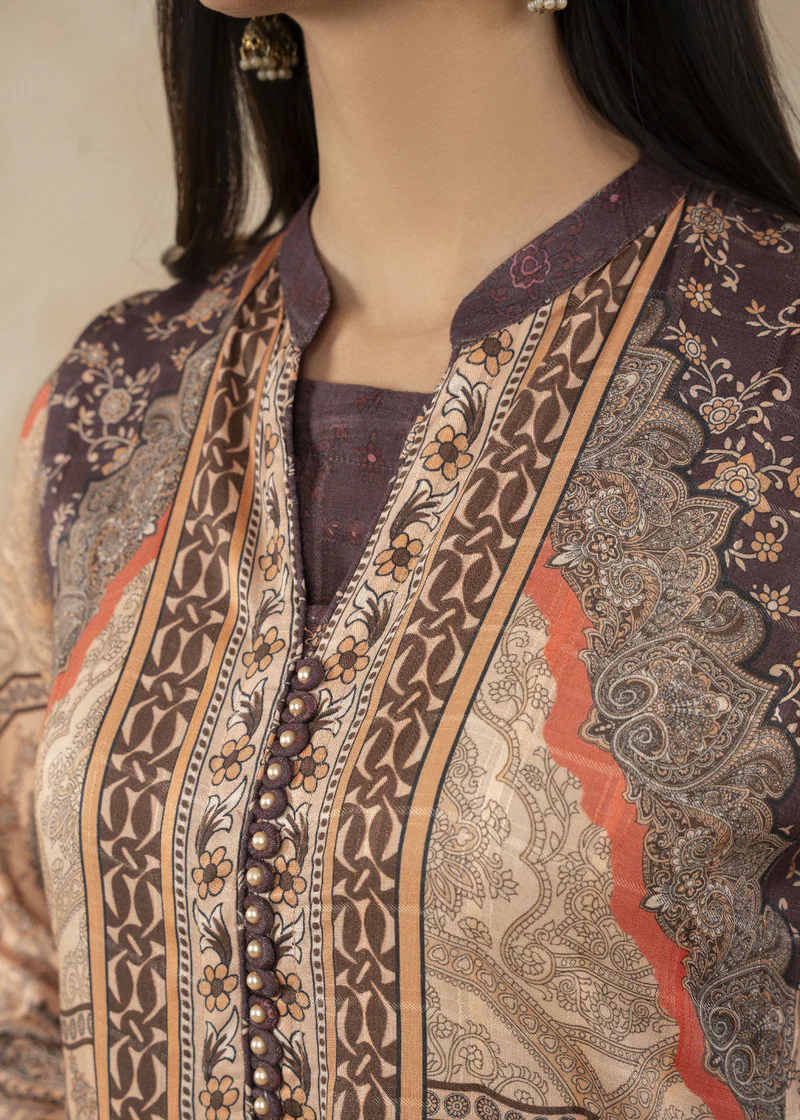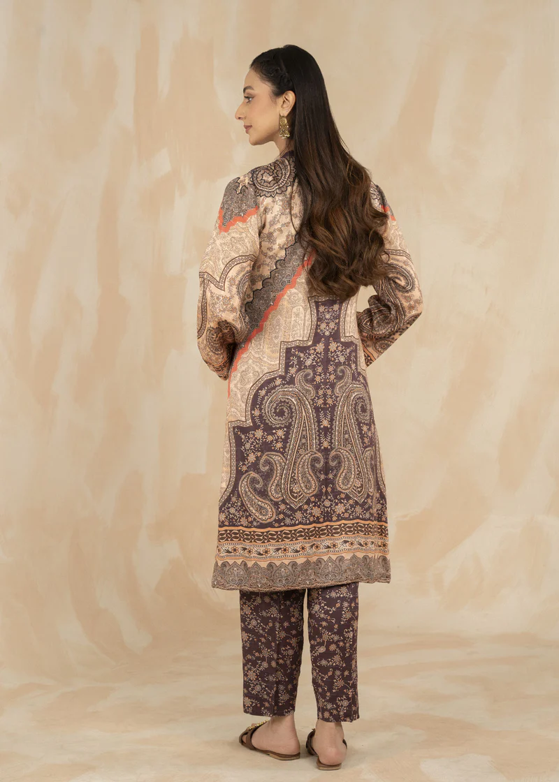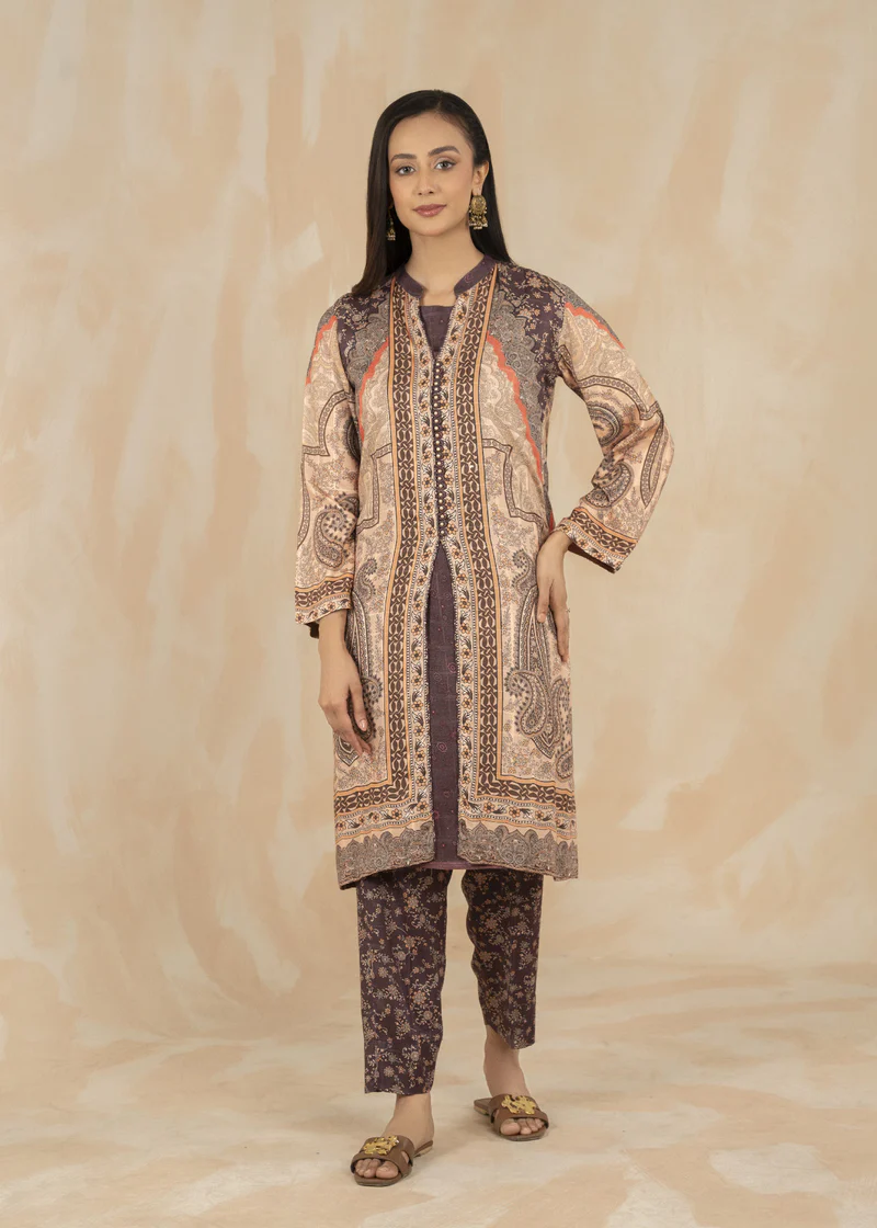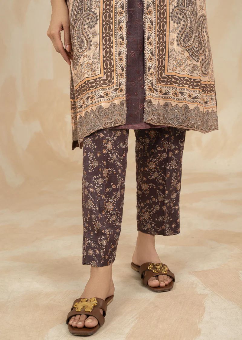 Additional Description: Pashmina is the opulent two-piece ensemble, the centerpiece is a stunning gown with attached inner decorated with lavish prints and a regal neckline. Paired with coordinating trousers, it exudes refined glamour in every detail.